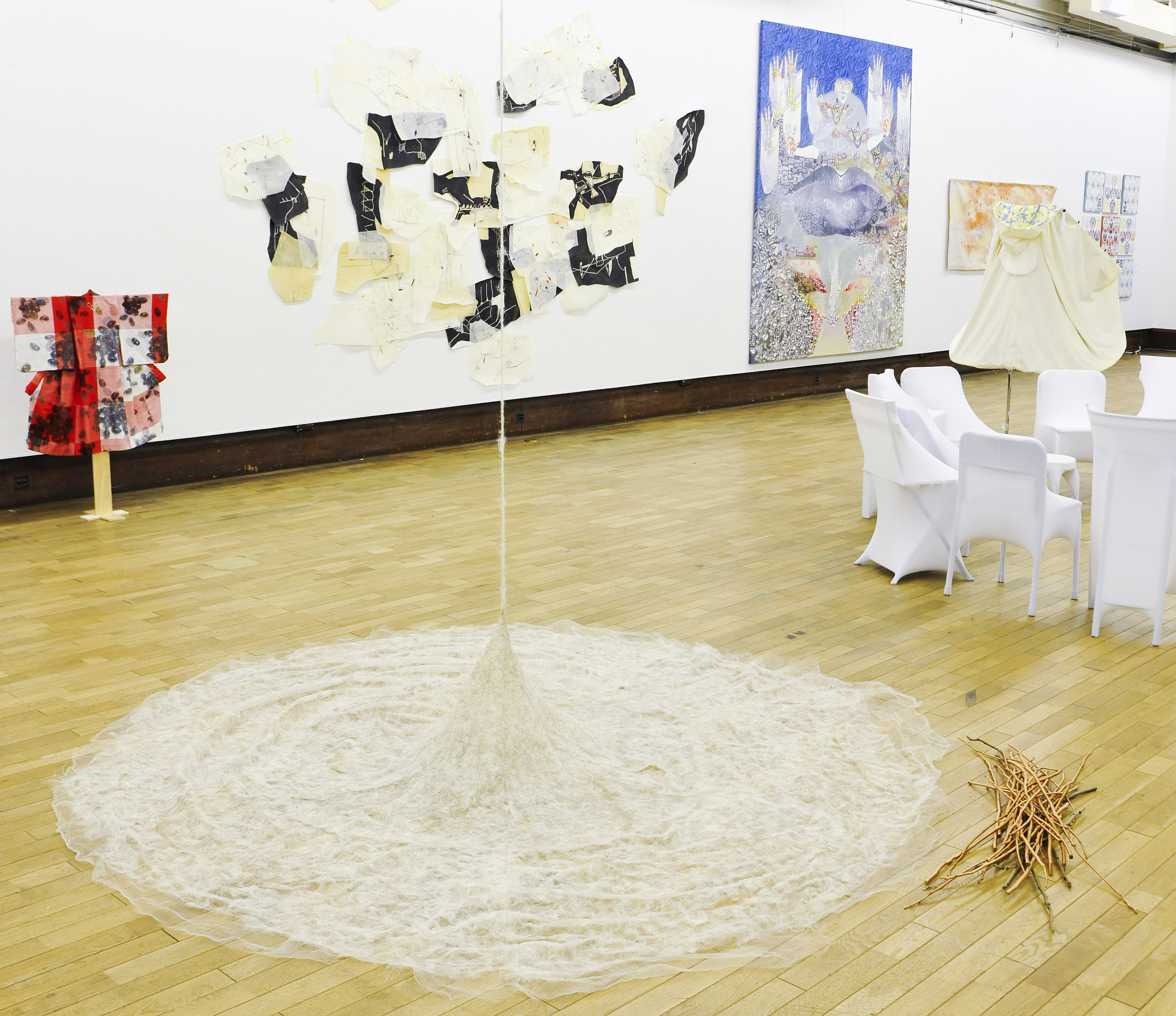 2014年度 同窓会賞 工芸科 染織専攻 4回生 小川 智美 OGAWA Tomomiサイズ:350.0×300.0×300.0素材・技法:黄麻・絹紗・絹糸・ミシン糸・枝・ミシンワーク・コイリング