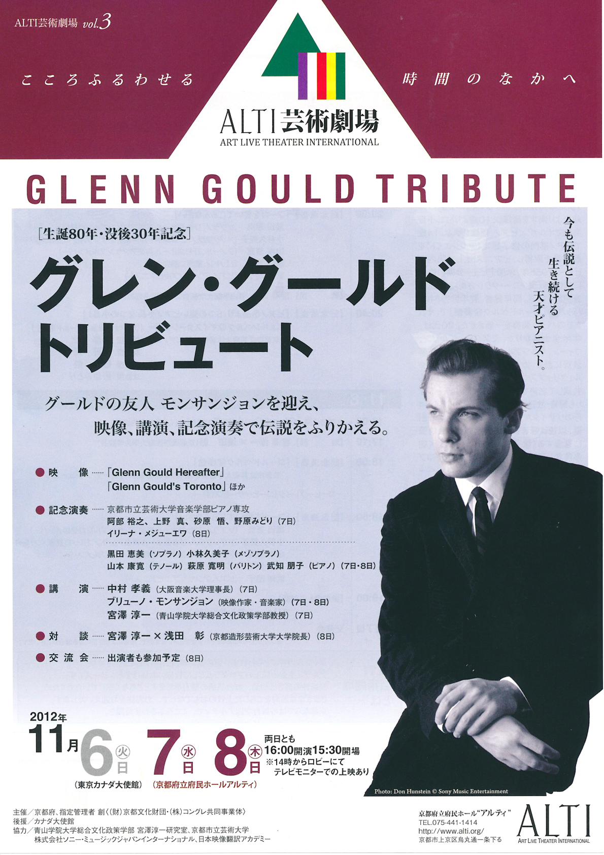京都府立府民ホール “アルティ”にて行われる、グレン・グールド生誕80年・没後30年を記念するイベントに、記念演奏として、京都市立芸術大学ピアノ専攻の阿部裕之教授、上野真准教授、砂原悟准教授、野原みどり准教授、イリーナ・メジューエワ講師が出演いたします。
