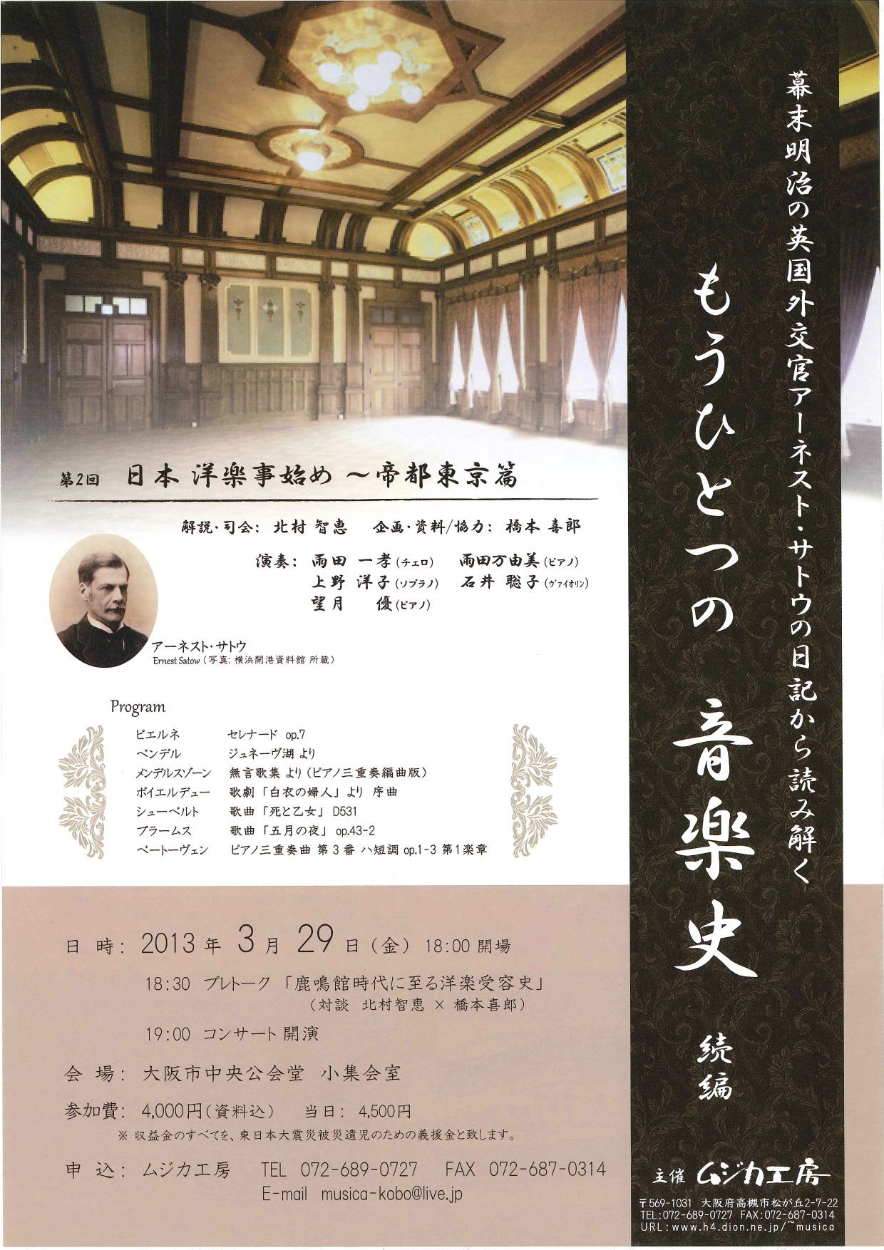 | プログラム | 幕末明治の英国外交官アーネスト・サトウの日記から読み解く 「もうひとつの音楽史」 『第2回 日本洋楽事始め〜帝都東京篇』 (解説・司会:北村智恵、企画・資料・協力:橋本喜郎)