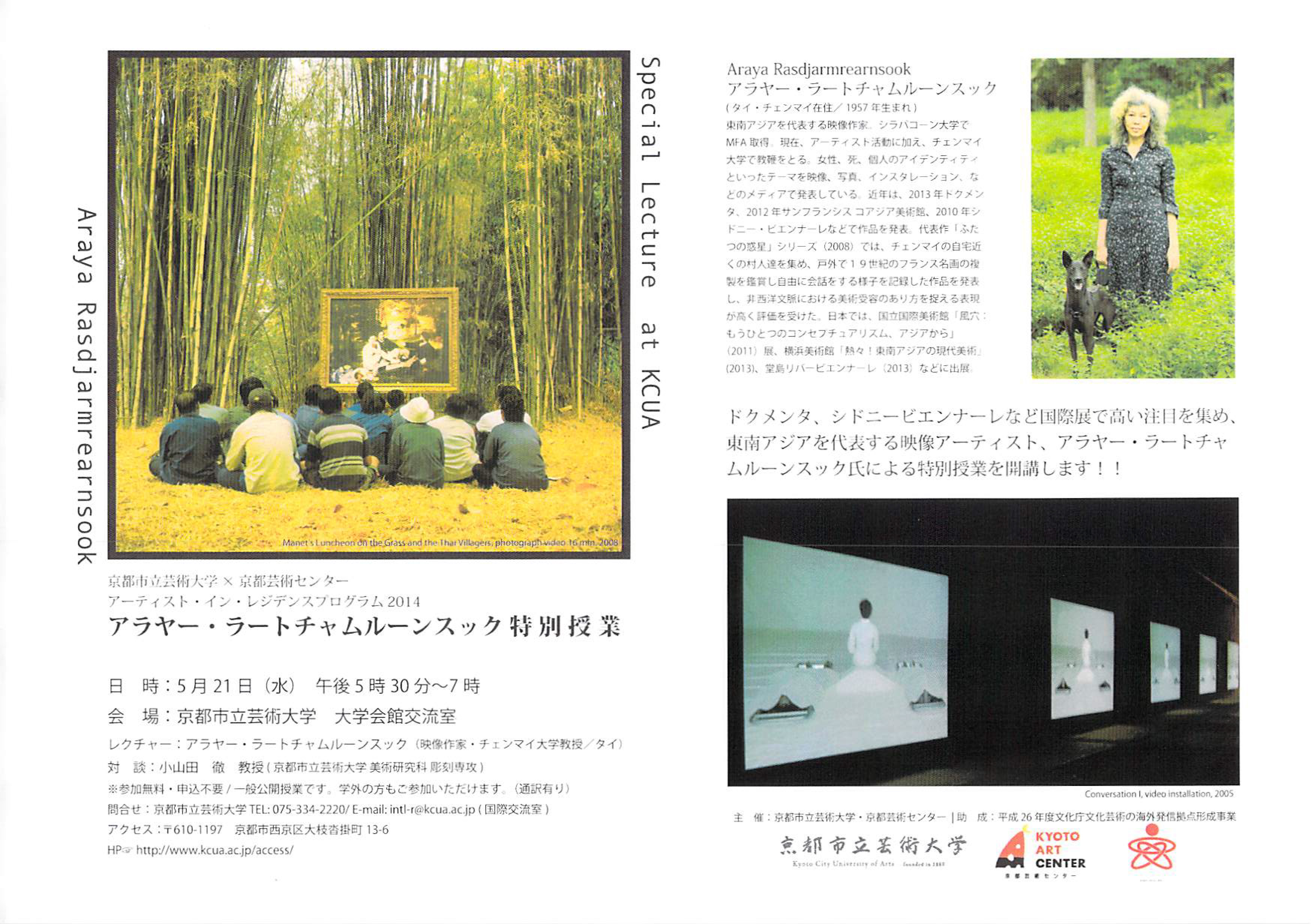| 講座内容等 | レクチャー:アラヤー・ラートチャムルーンスック(映像作家・チェンマイ大学教授/タイ) 対談:小山田徹 教授(京都市立芸術大学 美術研究科 彫刻専攻) |