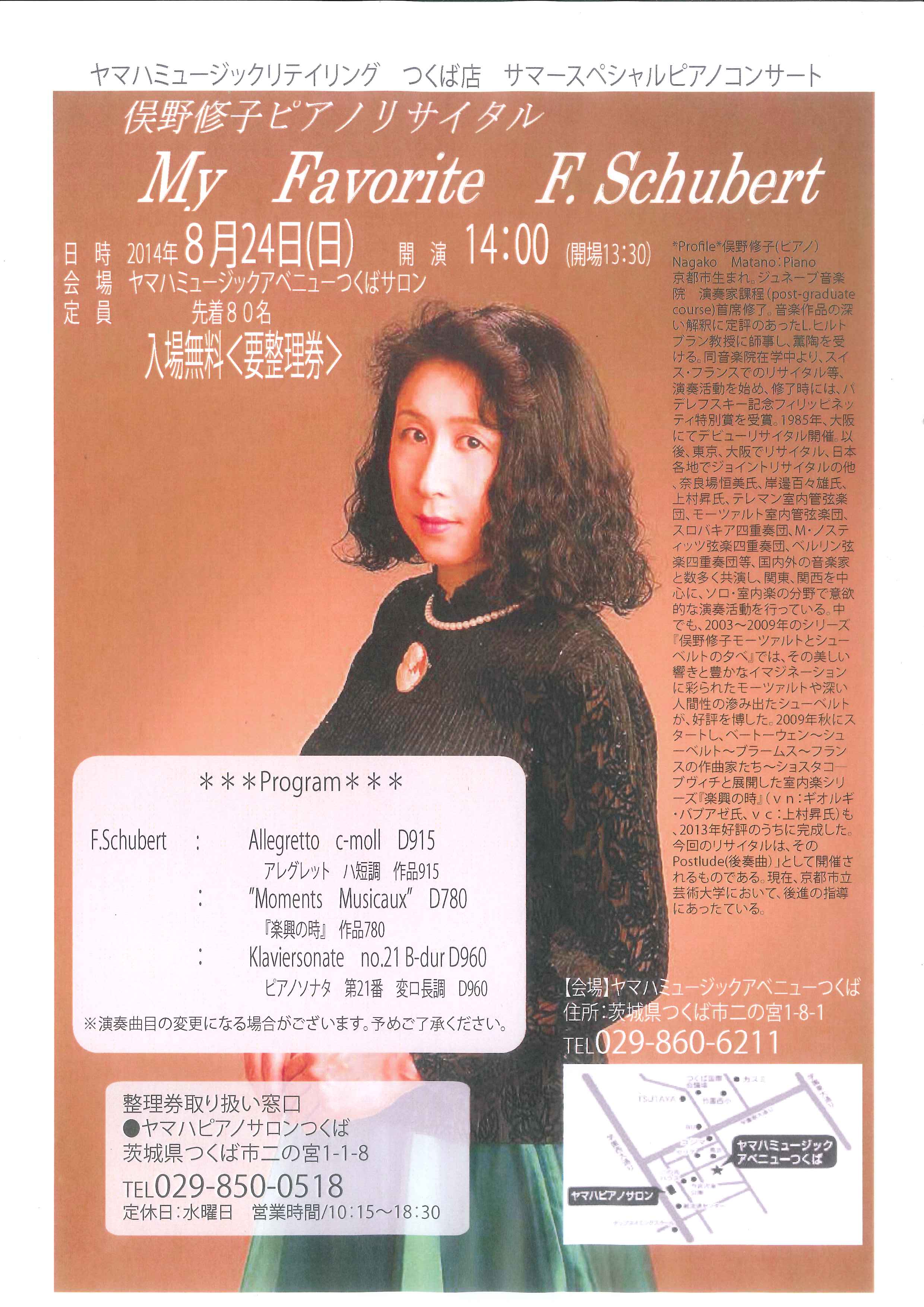 京都市立芸術大学音楽学部俣野修子非常勤講師によるピアノリサイタル「My Favorite F.Schubert」が,茨城県つくば市の「ヤマハミュージックアベニューつくば」で開催されます。