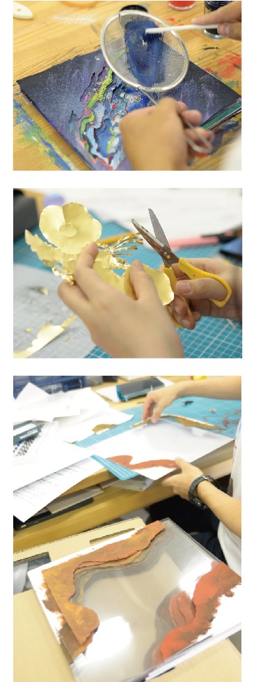 「七夕」をテーマとしながらも学生の自由な発想で展開し,作品を立体的(重層的)に完成させることで,様々な仕掛けを楽しめるイラスト表現にチャレンジし,新たな表現方法の実験とその可能性を模索しながら制作しています。