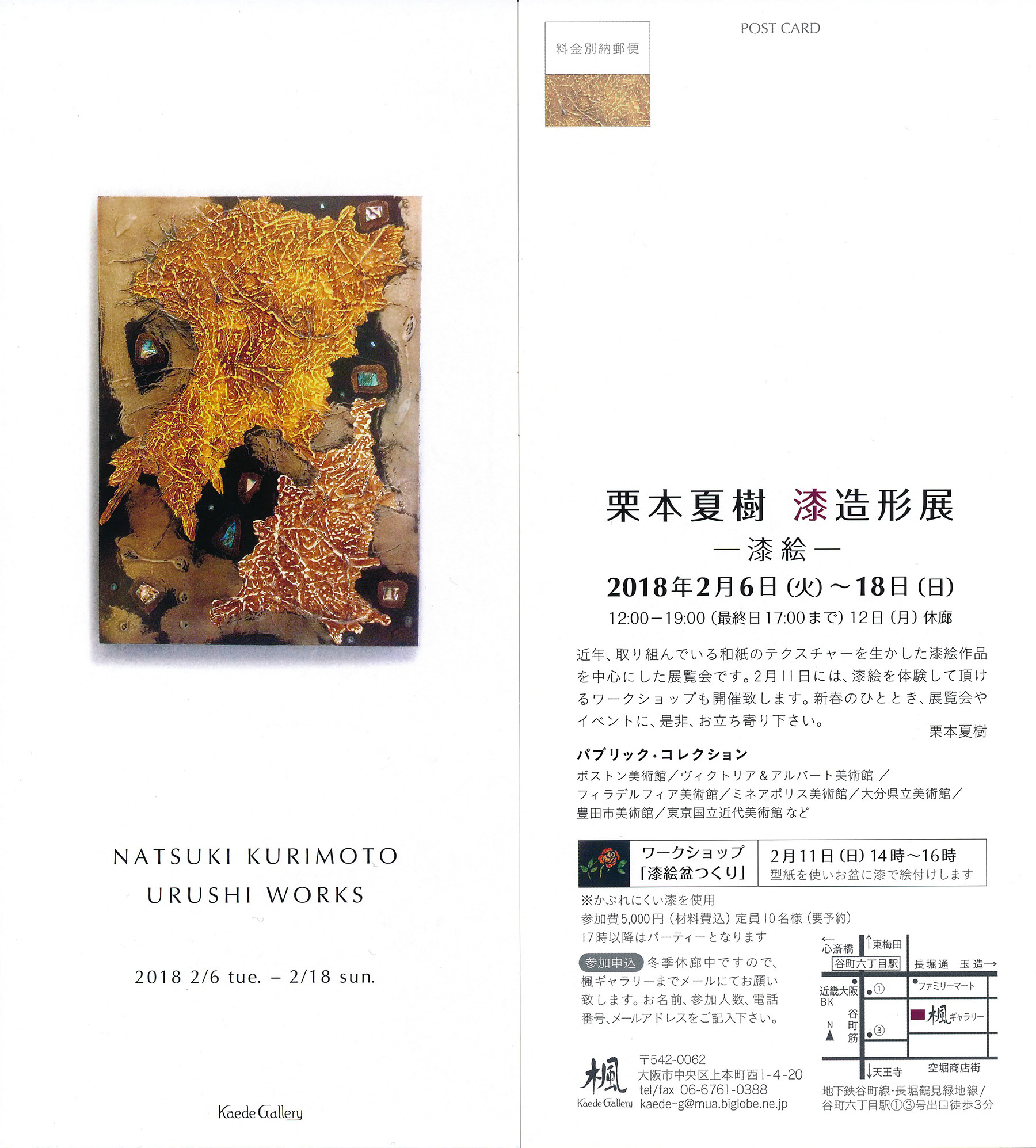 本学美術学部漆工専攻の栗本夏樹教授が,2月6日(火曜日)から2月18日(日曜日)まで,大阪市中央区の楓ギャラリーにおいて個展「栗本夏樹 漆造形展 ―漆絵―」を開催します。