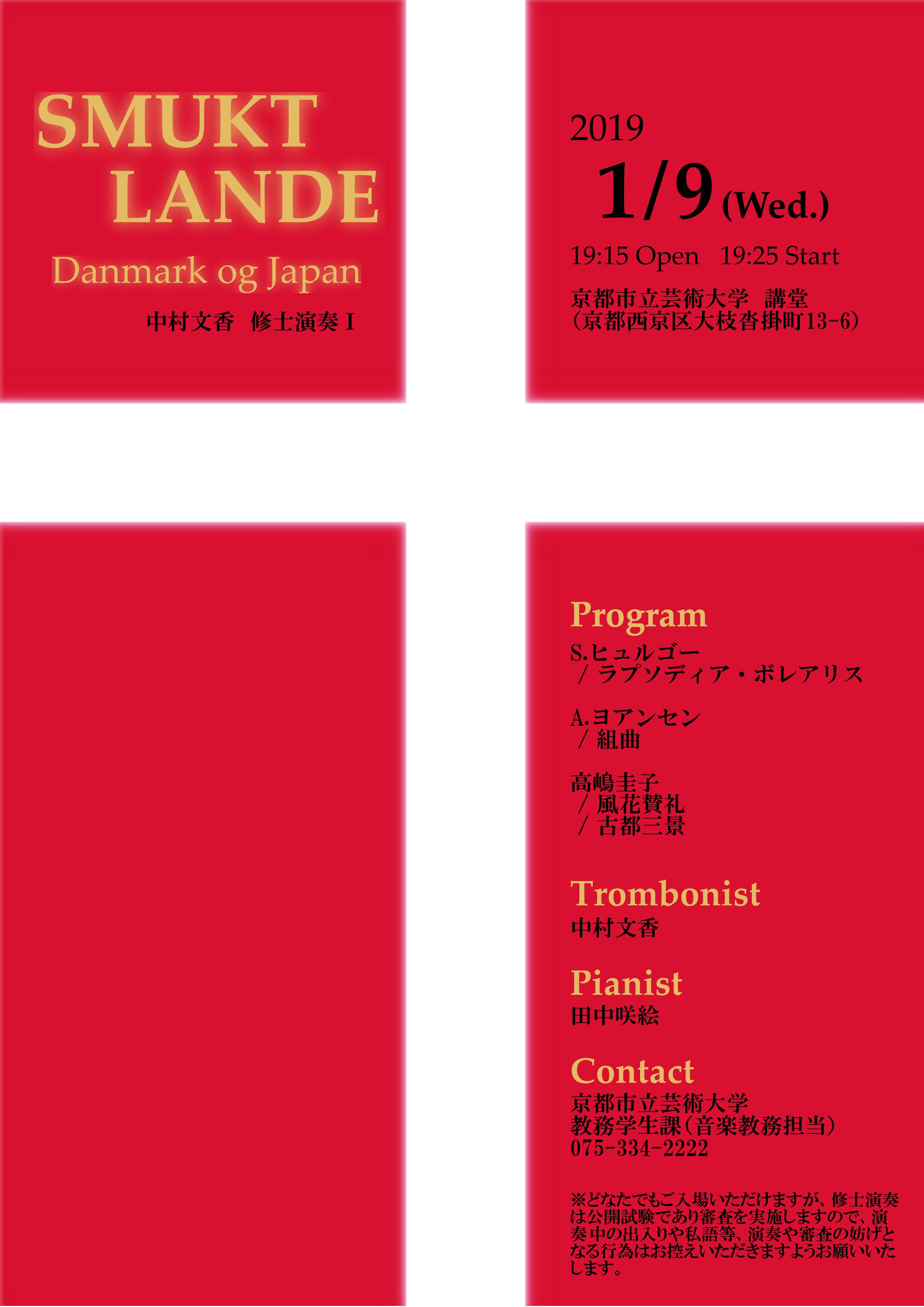 どなたでもご入場いただけますが,修士演奏は公開試験であり審査を実施しますので,演奏中の会場の出入りや私語等,演奏や審査の妨げになる行為はお控えくださいますようお願いします。