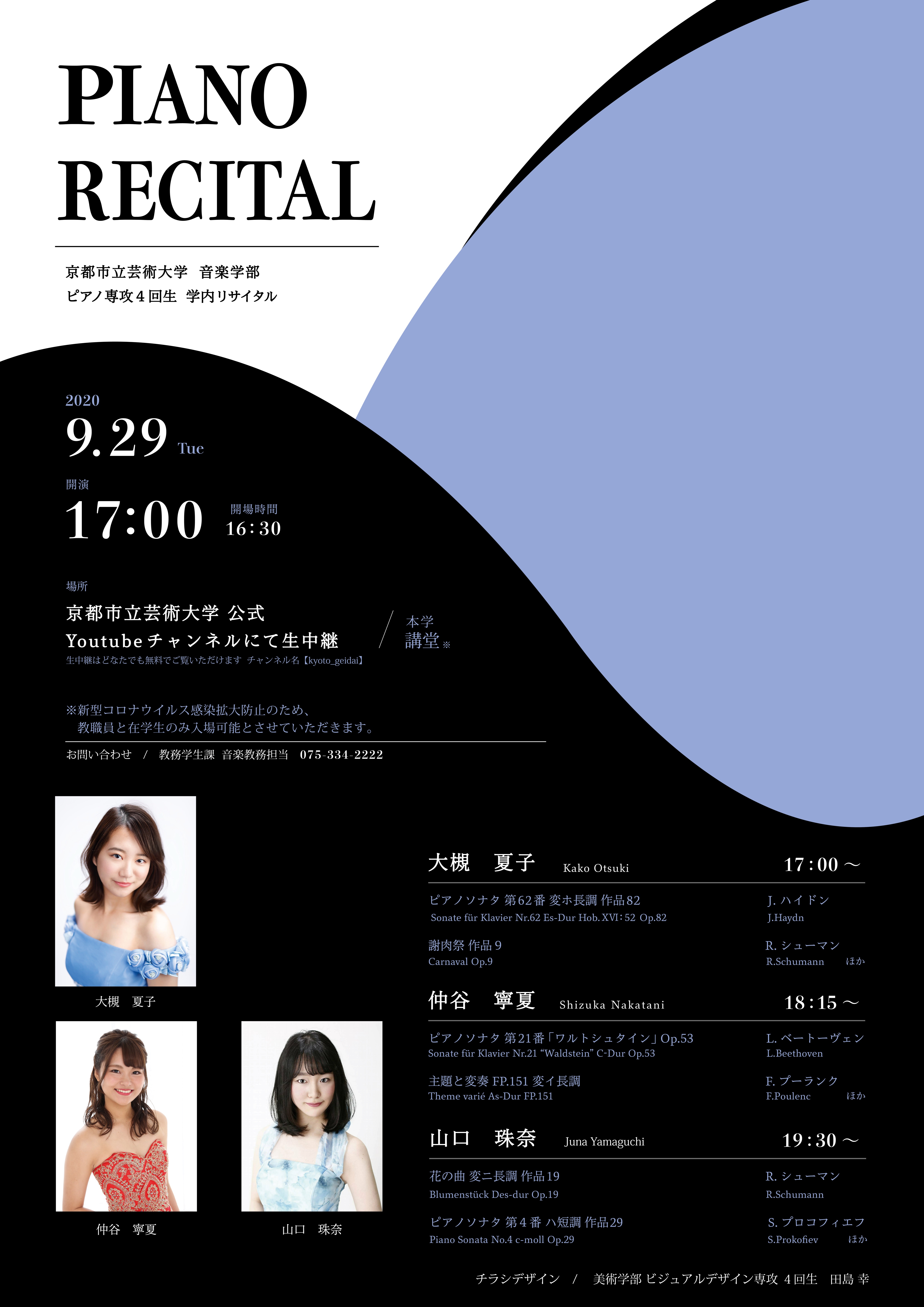 京都市立芸術大学音楽学部ピアノ専攻4回生によるピアノリサイタルを開催します。