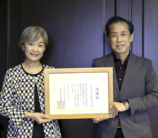 これに伴い,令和4年6月29日(水曜日)に,赤松玉女学長が京都市中京区のNISSHA株式会社本社を訪問し,NISSHA株式会社代表取締役社長であり,一般財団法人NISSHA財団理事長の鈴木順也様に対し,ご寄付への感謝の意を表して感謝状を贈呈しました。