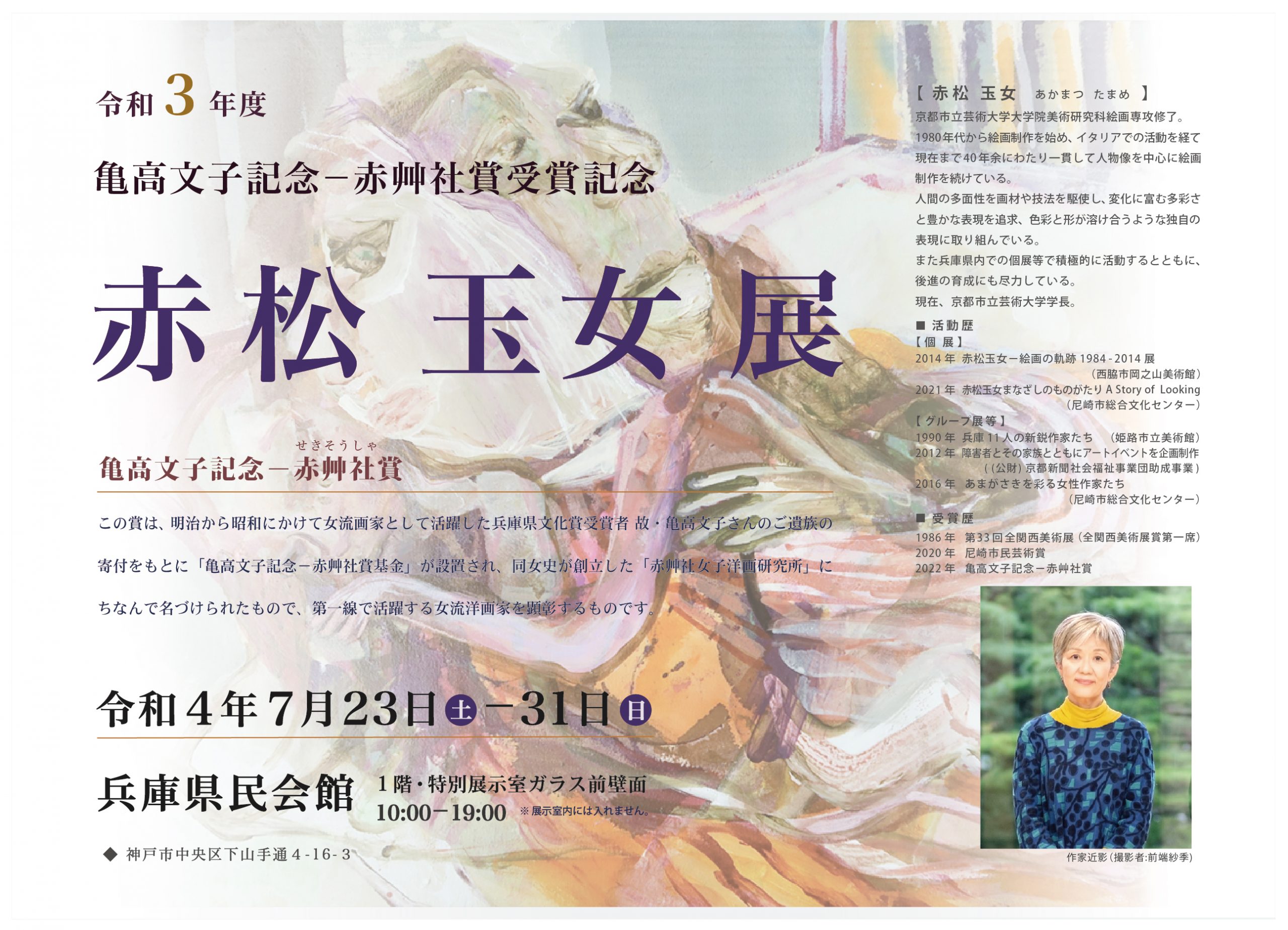令和3年度亀高文子記念-赤艸社(せきそうしゃ)賞を受賞した本学の赤松玉女学長の受賞記念展が、2022年7月23日(土曜日)から7月31日(日曜日)まで、兵庫県民会館1階で開催されます。是非お立ち寄りください。