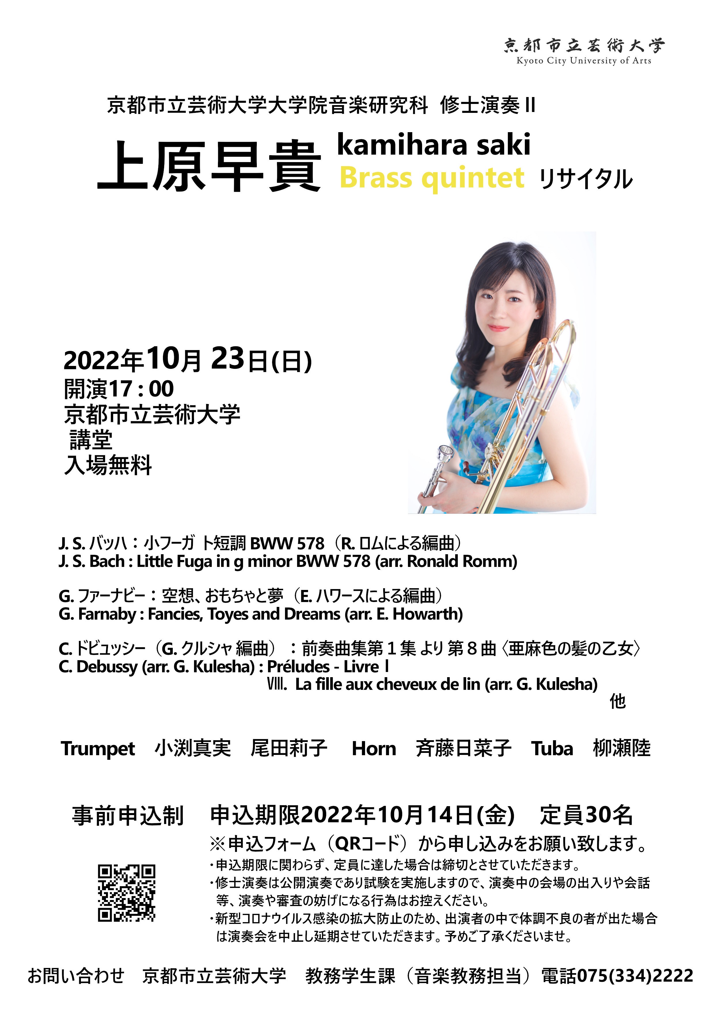 京都市立芸術大学では、2022年度大学院音楽研究科の学生による修士演奏を行います。