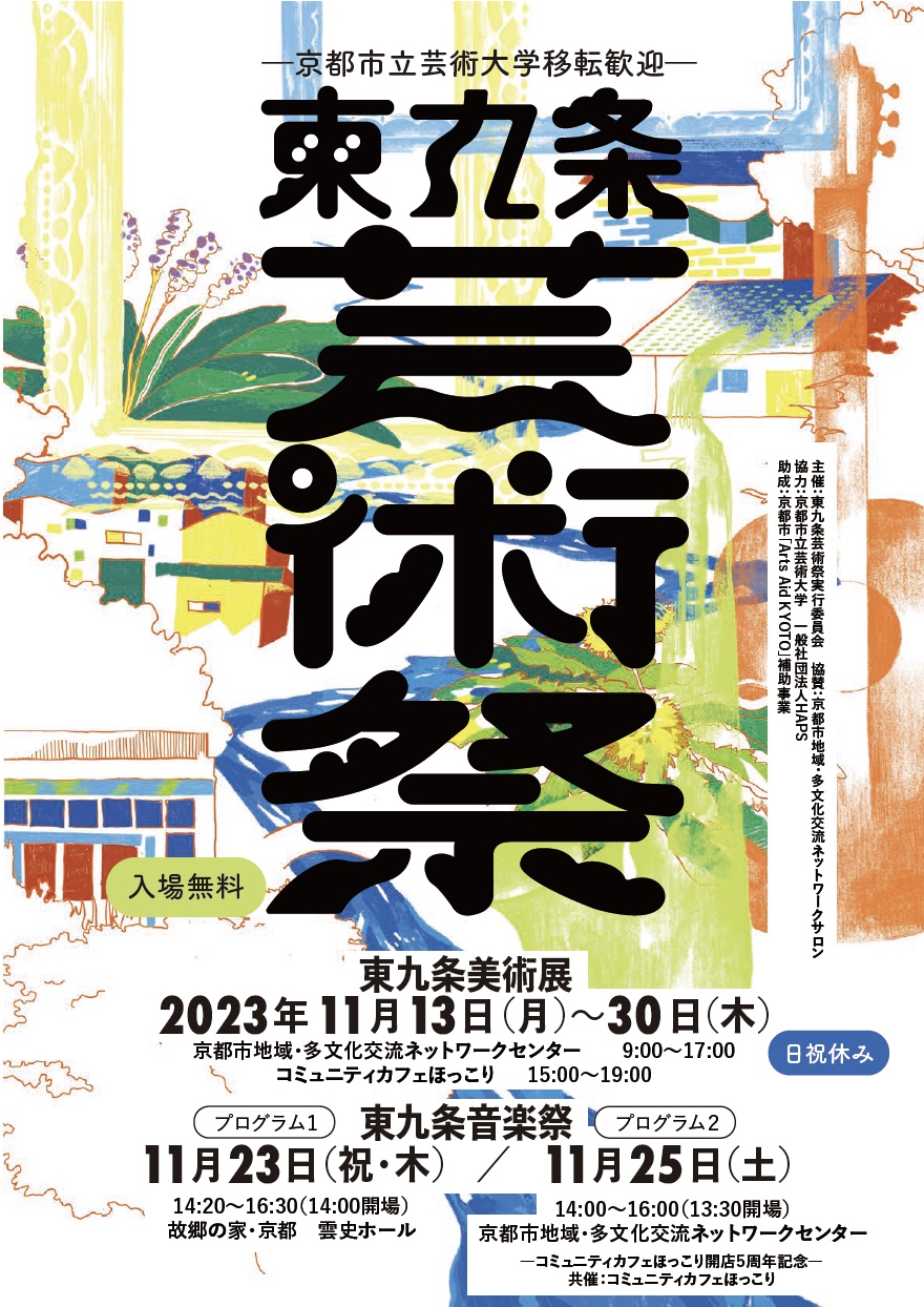 2023年11月13日(月曜日)から11月30日(木曜日)まで、京都市下京区・本学の新キャンパスのほど近くにある〈京都市地域・多文化交流ネットワークセンター〉および〈コミュニティカフェほっこり〉において、「東九条芸術祭」が開催されます。