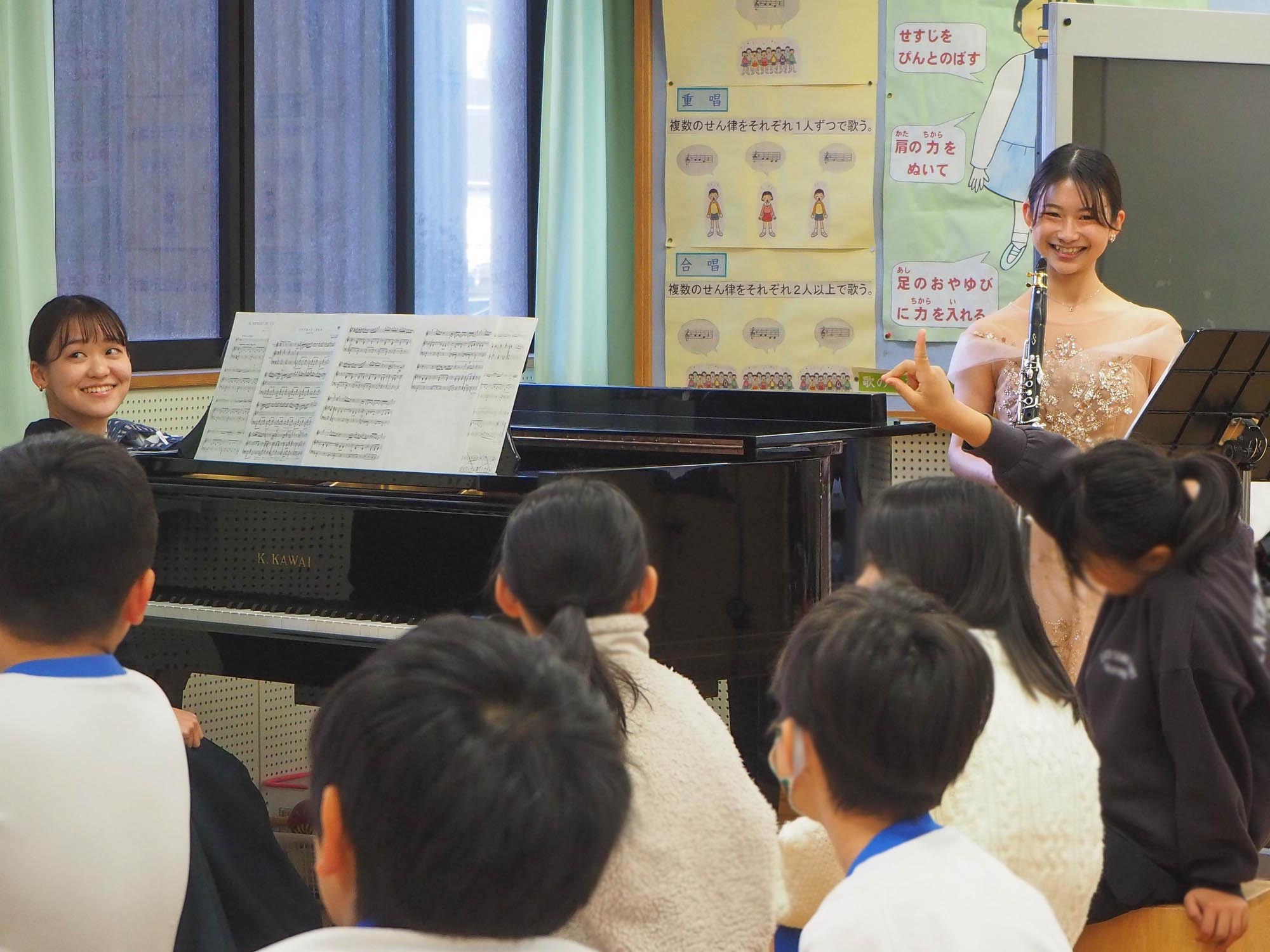 2023年12月1日(金曜日)、8日(金曜日)、13日(水曜日)、20日(水曜日)、京都市教育委員会のご協力のもと、下京区にある京都市立下京雅小学校、梅小路小学校、下京渉成小学校、洛央小学校の4校で、「地域とつながる音楽教育」プログラム(企画:清水久莉子特任講師/本学音楽学部)の一環として本学学生が4年生の授業内で鑑賞教材の演奏を行い、学級担任の先生方等とのコラボレーション授業を実施しました。