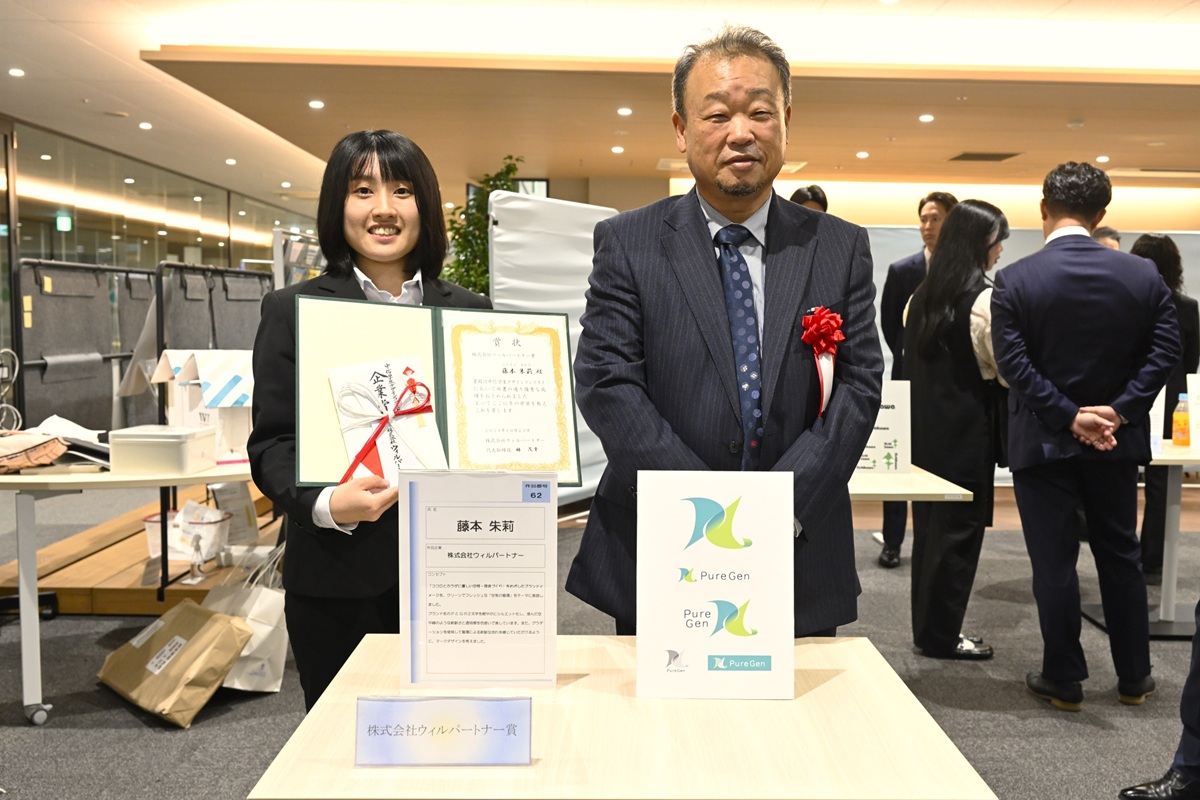 美術学部デザイン科ビジュアル・デザイン専攻の藤本朱莉さんが「株式会ウィルパートナー賞」を受賞し、同社代表取締役の林茂幸様から表彰を受け取るとともに、「一目見たときに、このデザインに一目ぼれして即決した、新ブランドの趣旨にぴったりの文字とカラーです」とのお言葉を頂戴しました。