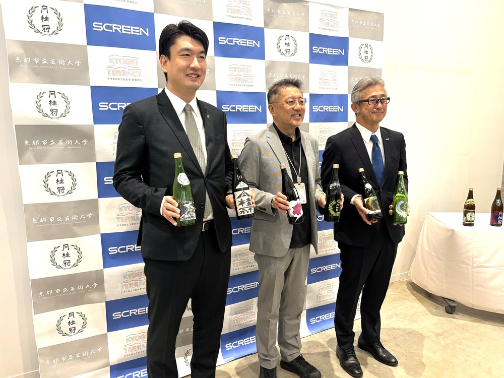 また、10月2日(木曜日)に本学において、オリジナルラベルによる日本酒の商品化に関する記者会見を行い、月桂冠から大倉泰治代表取締役副社長、SCREENから田中志佳代表取締役社長執行役員、本学から森野彰人美術学部長等が出席し、共同プロジェクトの目的や大学および各社の役割等について説明しました。