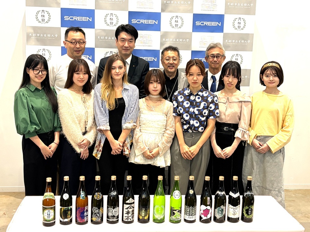 月桂冠株式会社(以下、「月桂冠」)様、株式会社SCREENグラフィックソリューションズ(以下、「SCREEN」)様および本学は、学生が月桂冠の日本酒ラベルのデザイン制作を通じてデザイン経験や商品化までのプロセスを実践的サポートのもと学び、3者が連携して未来の産業を担うデザイナーを共に育むことを目的とする産学連携プロジェクトを実施しています。