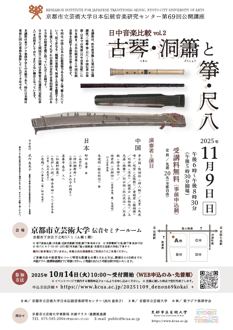 2025年11月9日(日曜日)に、日本伝統音楽研究センター第69回公開講座「古琴・洞簫と箏・尺八」を開催します。