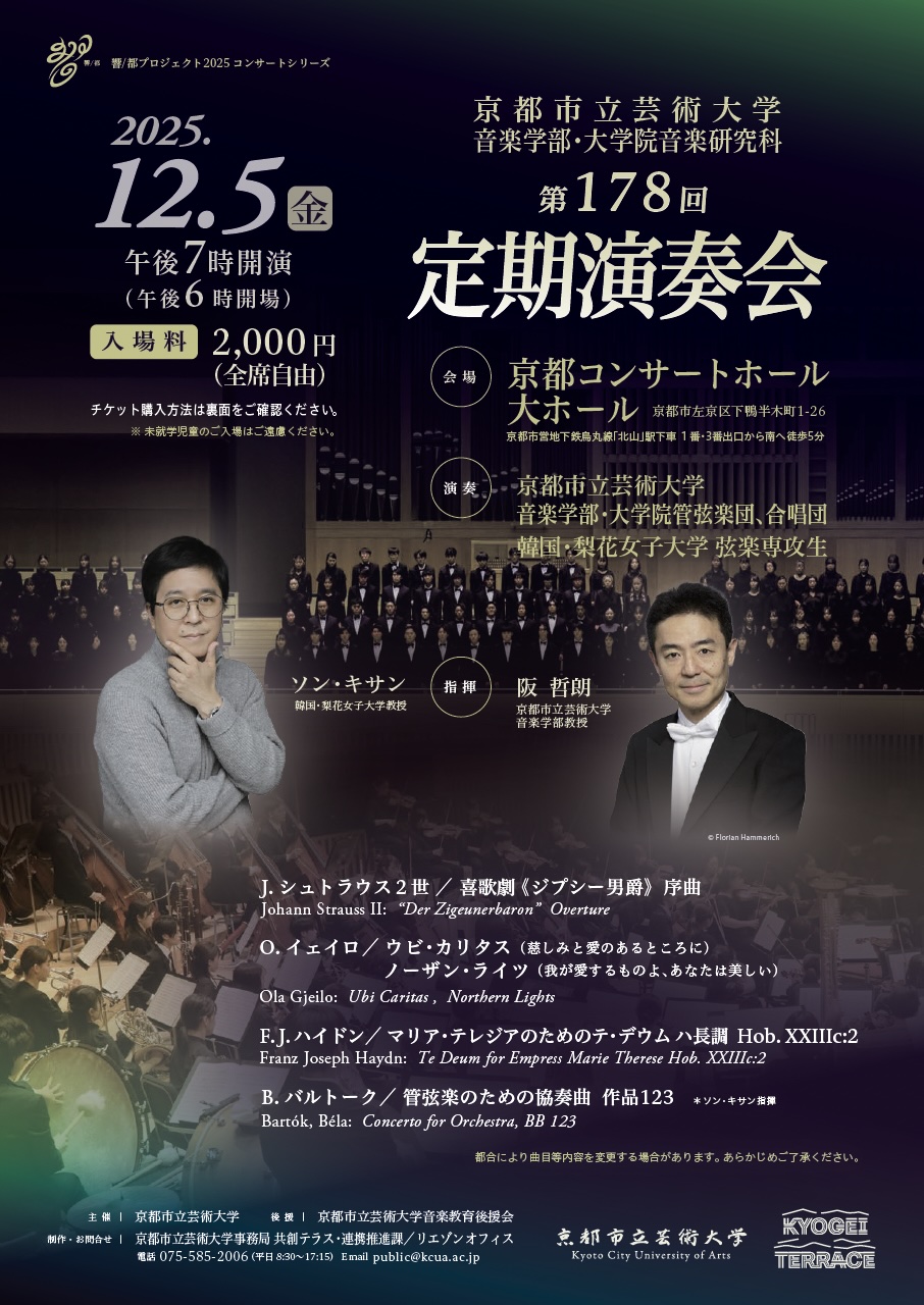 2025年12月5日(金曜日)午後7時より、京都コンサートホール 大ホールにおいて、京都市立芸術大学音楽学部・大学院音楽研究科 第178回定期演奏会を開催します。