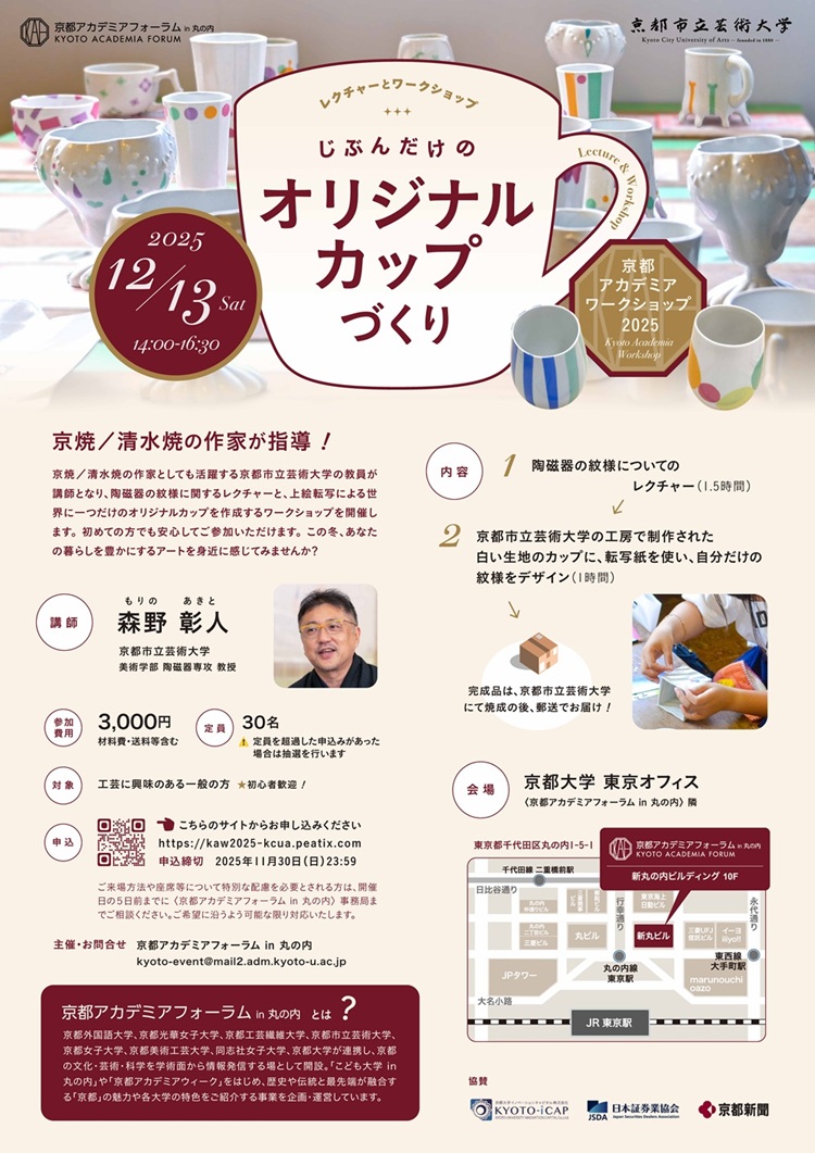 2025年12月13日(土曜日)、東京都千代田区の京都大学東京オフィスで開催される「京都アカデミアワークショップ2025」において、美術学部陶磁器専攻の森野彰人教授が陶磁器の紋様に関するレクチャーと、上絵転写による世界に一つだけのオリジナルカップを作成するワークショップを実施します。