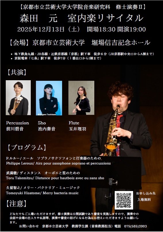 | 出演者 | 森田 元(サクソフォン) 前川 碧音(パーカッション) 池内 奏音(笙) 玉井 理羽(フルート) |