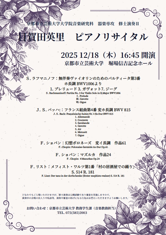 京都市立芸術大学では、2025年度大学院音楽研究科の学生による修士演奏を行います。