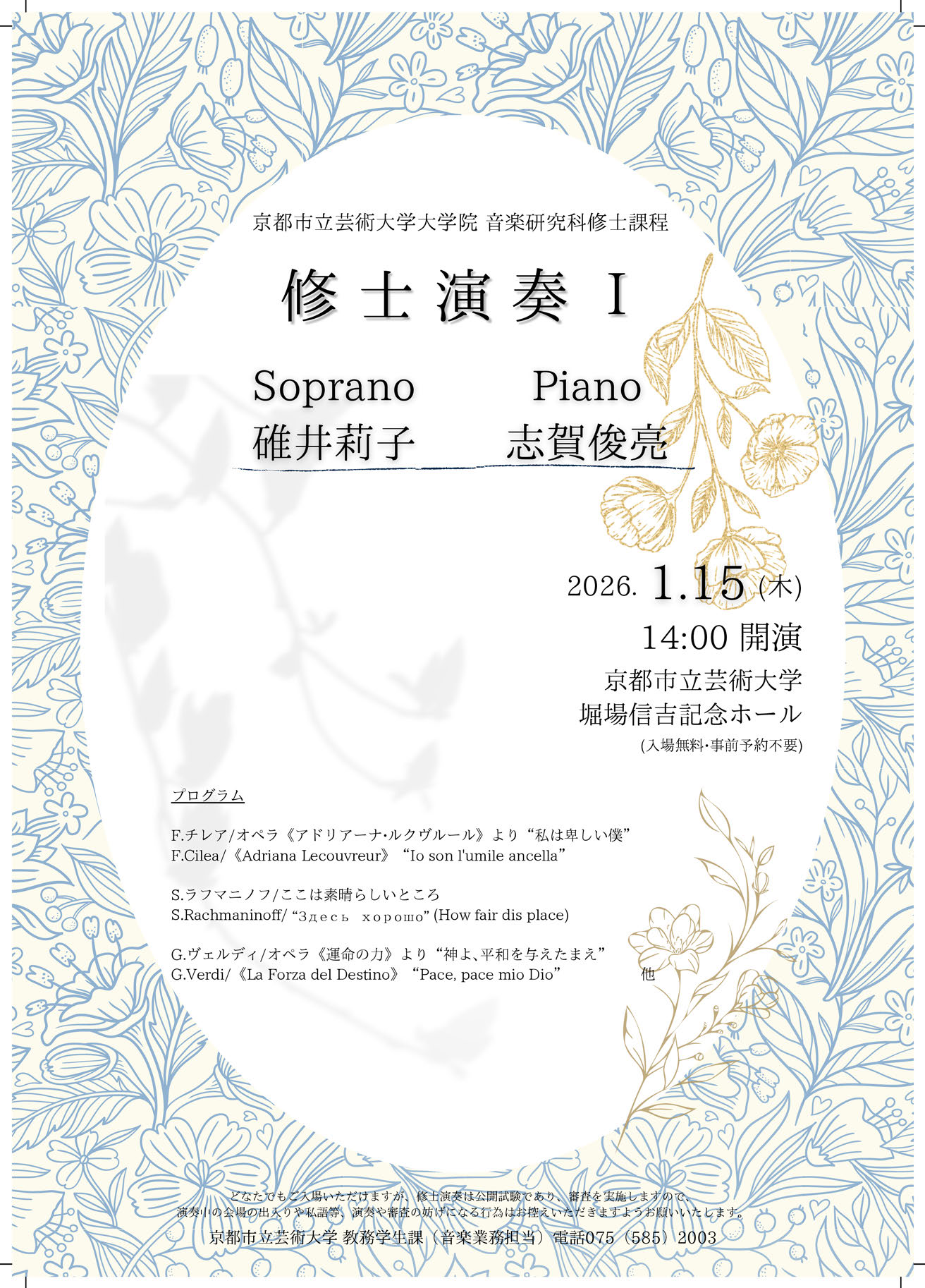 どなたでも御入場いただけますが、修士演奏は公開試験であり審査を実施しますので、演奏中の会場の出入りや私語等、演奏や審査の妨げになる行為はお控えいただきますようお願いいたします。