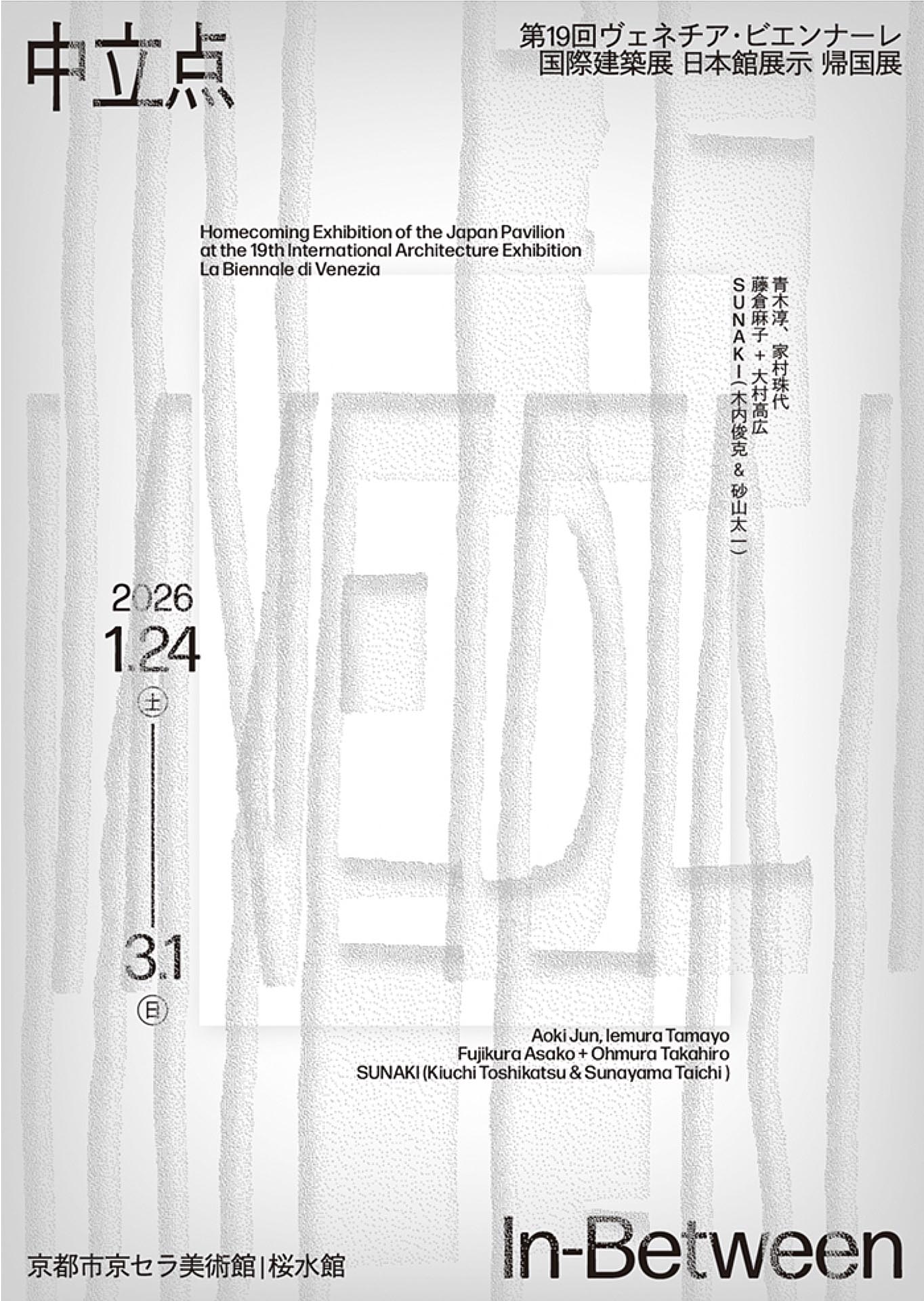 2026年1月24日(土曜日)から3月1日(日曜日)まで、京都市京セラ美術館の敷地内にある「桜水館」(旧事務所棟)ににおいて、第19回ヴェネチア・ビエンナーレ国際建築展日本館展示「中立点|In-Between」(主催:独立行政法人国際交流基金)の帰国展が開催され、本学美術学部総合芸術学専攻の砂山太一准教授が属するユニットSUNAKIのインスタレーション作品が展示されます。是非お出かけください。
