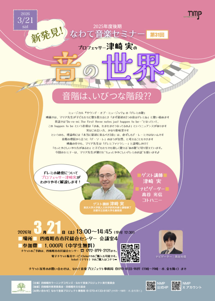 2026年3月21日(土曜日)、四條畷市市民総合センターで開催される「第31回なわて音楽セミナー プロフェッサー津崎実の「音の世界」音階は、いびつな階段??」に、本学名誉教授の津崎実氏がゲスト講師として登壇します。