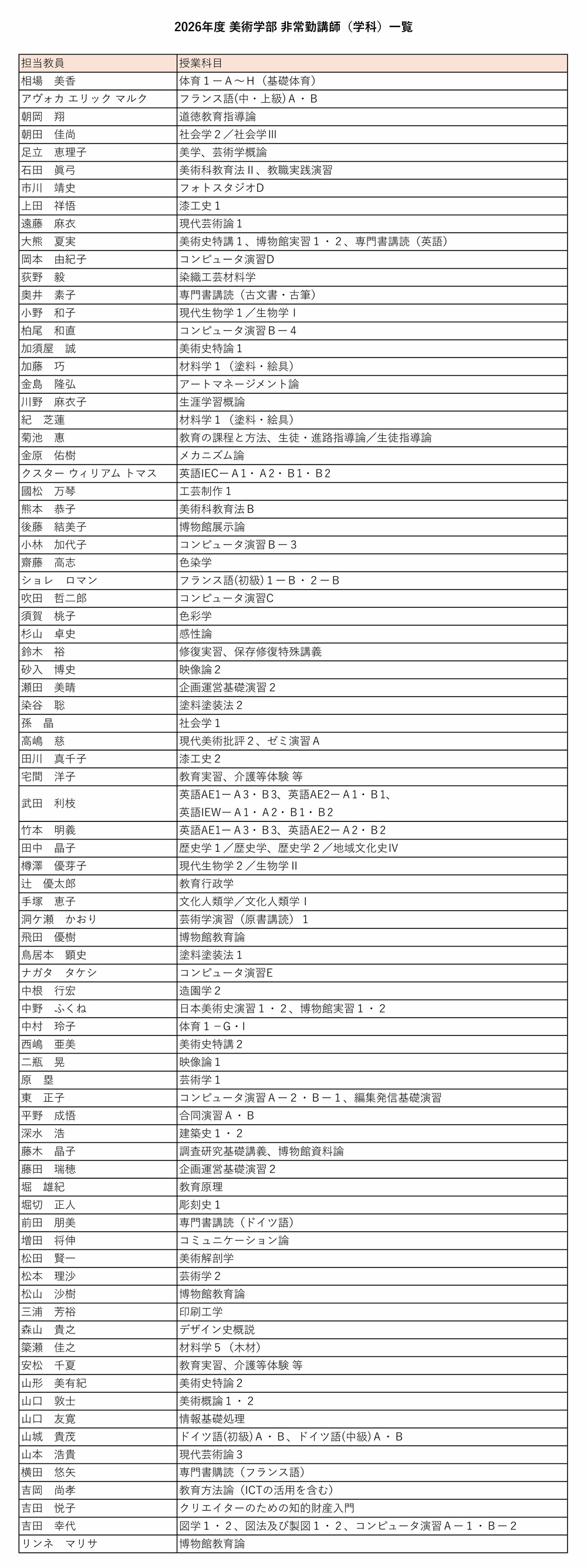 2025年度 美術学部 非常勤講師(学科)一覧(PDF)