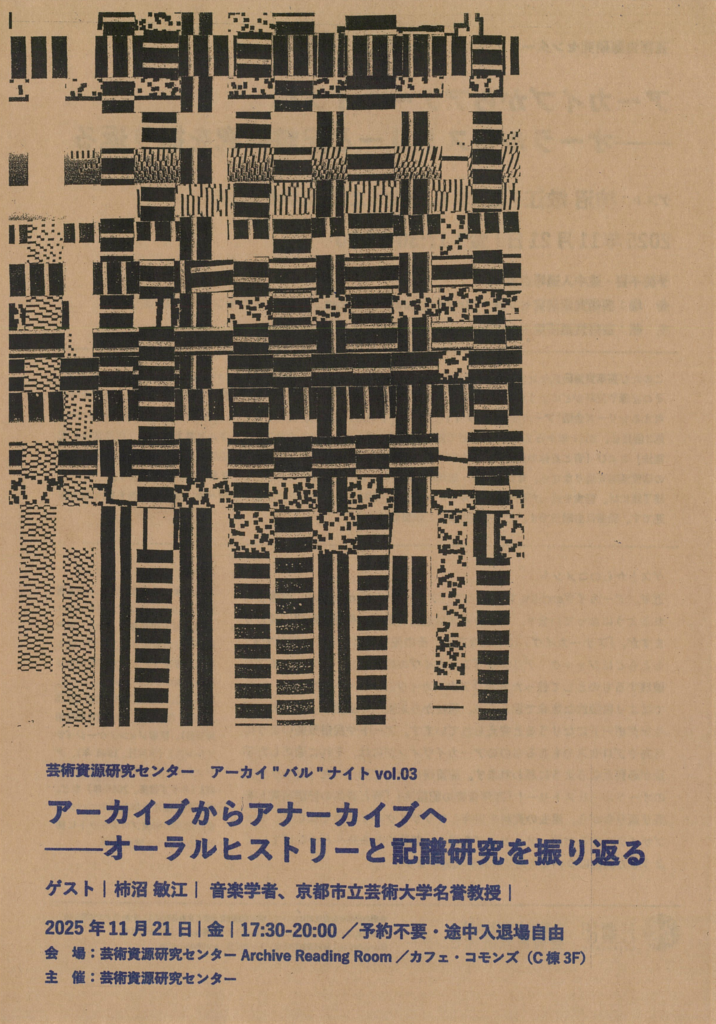 このたび芸術資源研究センターでは、新たに開設された「Archive Reading Room」において、過去の研究活動を振り返り、その記録や資料がどのような芸術資源として存在しうるのか、そして今後どのように保存・活用していくべきかを共に考えるシリーズ企画「アーカイ”バル”ナイト」をスタートいたしました。記憶をたどり、記録を未来へとつなぐ試みです。