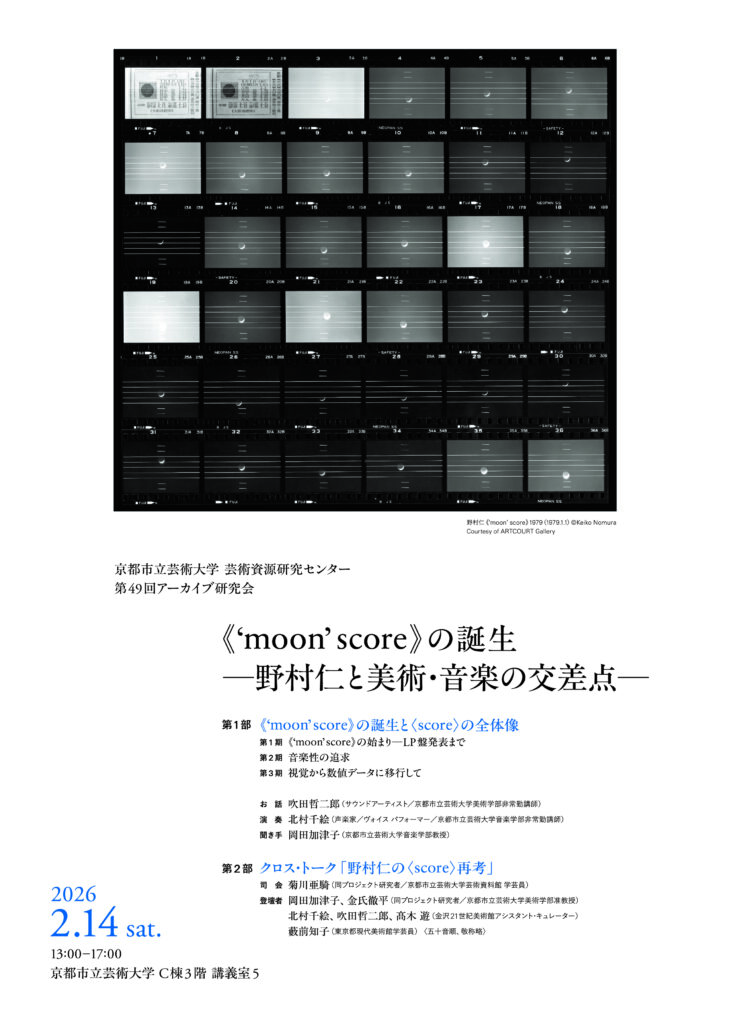 本研究会では、野村の代表作《‘moon’score》(1975‒)を取り上げ、 美術と音楽が交差するその成立背景をひもときます。五線譜を写し 込んだフィルムで月を撮影した本作は、1980年代以降、本学美術・ 音楽両学部の教員や学生との協働を通じて展開し、野村のライフワークとして発展していきました。本会では、譜面の実演を交えて、制作に携わった方々からお話を伺います。あわせて、音楽に深い造詣をもっていた野村の旧蔵資料を紹介し、美術史・音楽史の識者とともに〈score〉の構想がいかに育まれたのかを読みときます。