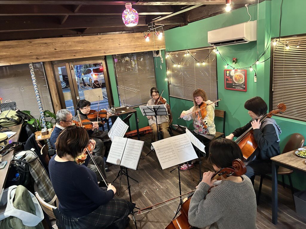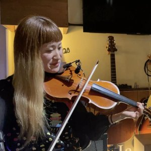 ■ポップスでの演奏活動 ―演奏活動についても伺いたいんですが、外から情報を見ている範囲だと、ギター弾き語りの人のサポートをしたりとか、カフェでライブしたりとか、大学を卒業してからはクラシックではないジャンルで活動を始めたじゃないですか。それが面白いなと思って見ていたんです。どういう経緯でそうなったんですか? 飯田:周りの人に恵まれていて、面白い友達と知り合うことが多かったんです。一乗寺におしゃれなバーというかカフェがあって、月一回オープンマイク(飛び入り参加可能なステージ)をやっていたんです。当時ヤマハで講師をしていたヴァイオリンの人から、こういうのがあるから出てみない?って言われて、ちょっとクラシカルな感じで出たんですよ。そこに出ている人たちは大体ブルース系をやる人が多くて、渋いおっちゃんとかもいたんですけど、そこのひとりに「バンドやってるんだけど、よかったら今度遊ぼう」みたいに声をかけてもらったんです。で、ぜひぜひ!って言って、それが実現して一緒にカラオケに行ったときに、「こんな感じでやってるんだけど、ヴァイオリンで入れない?」みたいなことを聞かれて、やります!って言ったんです。そういうのをやっていくうちに、色んな人と知り合うようになりました。ライブができるカフェで演奏したときに、「うちでもヴァイオリン弾いてよ」って言われたり。 今はもうなくなっちゃったんですけど、河原町にキルシェっていうカフェがあったんです。そこでイミンズっていうバンドでライブをやったときにすごく気に入ってもらえて、そこのオーナーに、「ランチタイムにヴァイオリンを弾いてほしい」と言ってもらって、そこでBGM演奏みたいなことをやったりして、気がついたら普通のバイトまでさせられていました。 ―ここに来て初めてのバイト?! 飯田:そうなんですよ、初めてのバイトです(笑)。大学の頃にちょっとだけバイトしてましたが、卒業してからは初めてのバイト。ライブに来る人たちとのやりとりとか、ブッキングみたいなこともやっていました。2、3年ぐらいやったのかな。深夜までやってるライブカフェみたいなところだったので、出演者が結構多いんですよ。そこで知り合った人とかとも一緒にやるようになって。 ―普通のカフェバイトと思いきや、ライブハウスのスタッフみたいな感じですね。 飯田:でもライブはそんなに多くはないので、主にドリンクを作ってました(笑)。ライブの日は、教室が終わってからカフェに行ってドリンクを作って。午前2時ぐらいまで営業していたので、 深夜に家に帰る生活でした。楽しかったですけど。 ―飯田さんの演奏ジャンルとしては、ポップスになるんですかね。アイリッシュ的なこともされるんですか? 飯田:ポップスですね。アイリッシュはやらないです。できないですね。ポップスといってもギター弾き語りが多いので、サポートみたいな感じです。 ―音源を渡されて、それを聴いてヴァイオリンのフレーズを考える感じですか? 飯田:音源とコード譜を渡されて「好きなように入って」みたいなのがほとんどですね。 ―コード譜は読めたんですか? 飯田:読めるのは読めるんですけど、時間はかかりますね。今でこそちょっと慣れてきましたけど。京芸の作曲の授業で、和声分析とか楽曲分析とかやるじゃないですか。私は1ミリもわからなかった。今では自分の曲を作ってますけど。今年オリジナル曲のCDを作ろうかなと思ってるんです。音源は大体もうできてるんですけど、ギターも自分で弾いて入れたりしています。それでコードは慣れてきたかなという感じはありますね。 ―オリジナル曲!いいですね。ヴァイオリンとギターだけですか?打ち込みでバッキング音源も作ったりしてるんですか? 飯田:打ち込みも自分で作って入れてます。ドラムは全然わからないんで、ループ機能みたいなのを入れて、いい感じのものを組み合わせてます。ベースラインとかは打ち込みで入れたりしてますね。7年ぐらいサポートで一緒にやってるギター弾き語りの人がいるんですけど、2年前ぐらいに「オリジナル曲、作りなよ」って言ってくれて、とりあえず作ってみたんです。演奏してもらうにはデモ音源を作らなきゃいけないっていうことで、そこからGarageBand(音楽制作アプリ)を使い始めました。 初めて曲を作ったのはもうちょっと前で、ヤマハの講師のギタリストとかと4人ぐらいで、ライブをやろうって声をかけてもらったときです。ジャズとかめちゃくちゃ上手な人たちで、その人に「お前も1曲作ってこい」って言われて。で、一応コード譜だけ作って渡したら、勝手にいい感じにやってくれたんです。そこで初めて2曲作ったんですけど、それは音源は作っていませんでした。 そこからちょっと期間が空いて、今一緒にやっているギターの人に、ちゃんとオリジナル曲を作ったらと言われて、年に4、5回、ライブがあるたびに1曲作るというのを目標にして、自分でデ