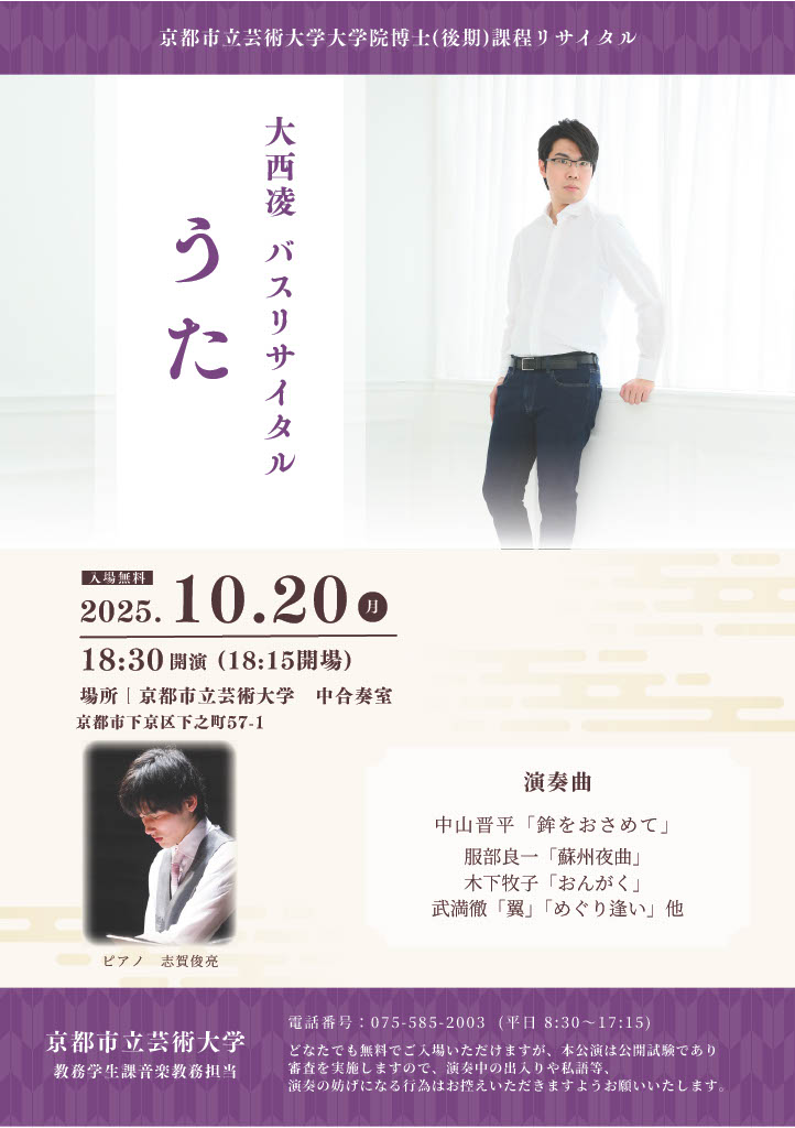 〈博士課程年次リサイタル〉大西凌バスリサイタル2025/10/20京都市立芸術大学 中合奏室開催予定大学関連演奏会