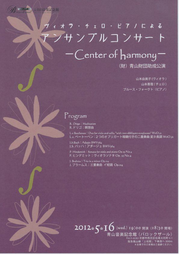財団法人青山財団助成公演 ヴィオラ・チェロ・ピアノによるアンサンブルコンサート「Center of harmony」に、京都市立芸術大学音楽学部非常勤講師 山本由美子と、卒業生 山本善哉が出演いたします。