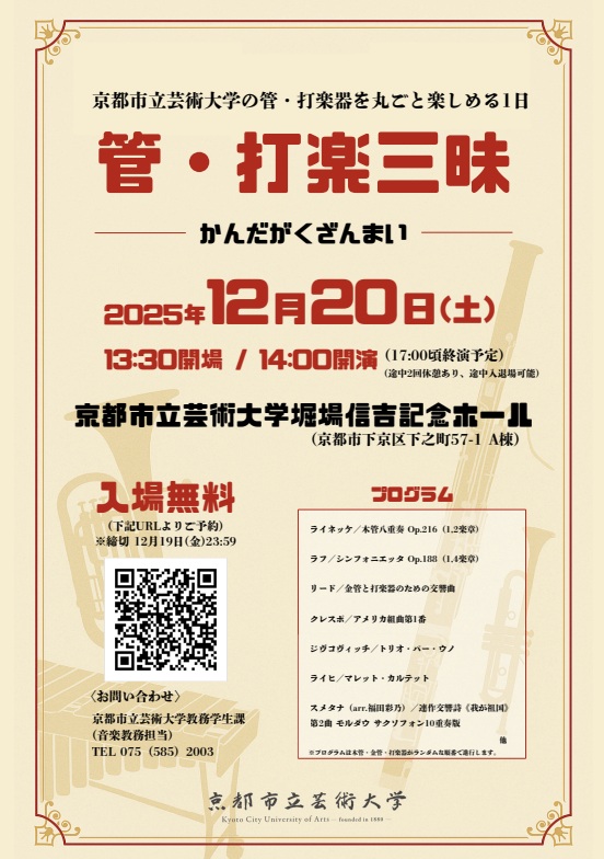 2025年12月20日(土曜日)14時00分より、本学堀場信吉記念ホールにおいて、音楽学部管・打楽専攻による「管・打楽三昧」を開催いたします。