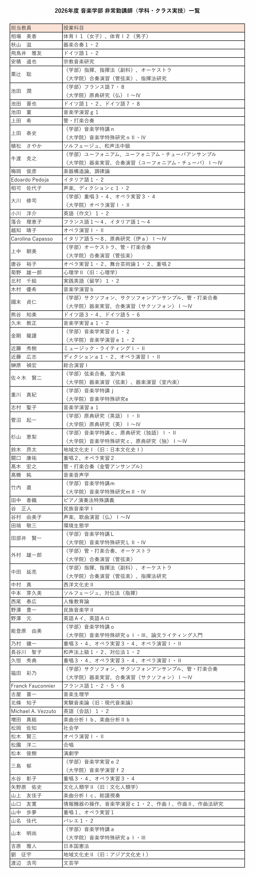 2026年度 音楽学部 非常勤講師(学科・クラス実技)一覧(PDF)