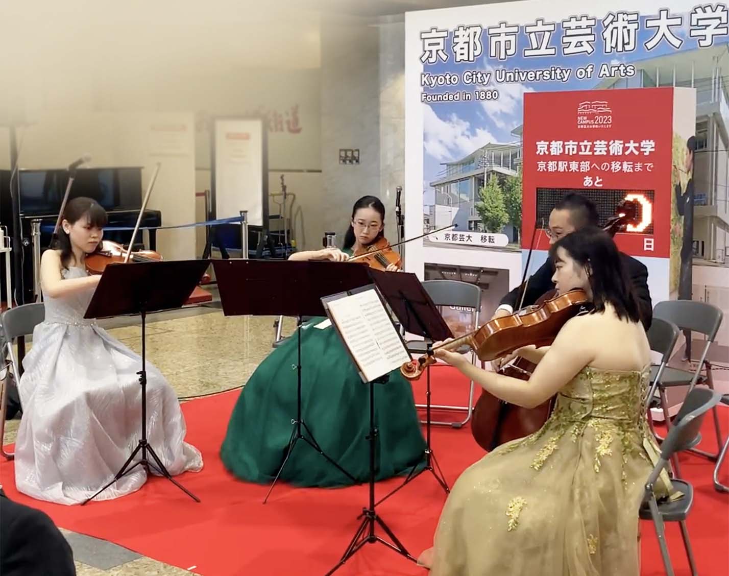 京都駅ビル西口広場(JR京都駅 西口改札前)にて、音楽学部の学生らによる弦楽四重奏を披露しました。(2023年10月1日)