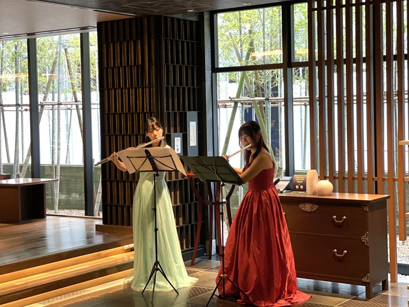 ダブルツリーbyヒルトン京都駅のエントランスロビーにて、音楽学部及び大学院音楽研究科の学生がフルートデュオによる「クリスマス特別演奏会」を開催し、ホテルのクリスマスを華やかに彩りました。