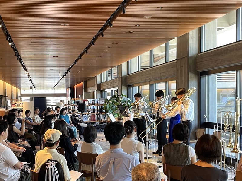 ロームシアター京都のイベント「劇場の音楽室」において、音楽学部の清水久莉子特任講師の企画・監修のもと、管・打楽専攻や弦楽専攻の学生たちが出演し、ロビーコンサートを開催しました。