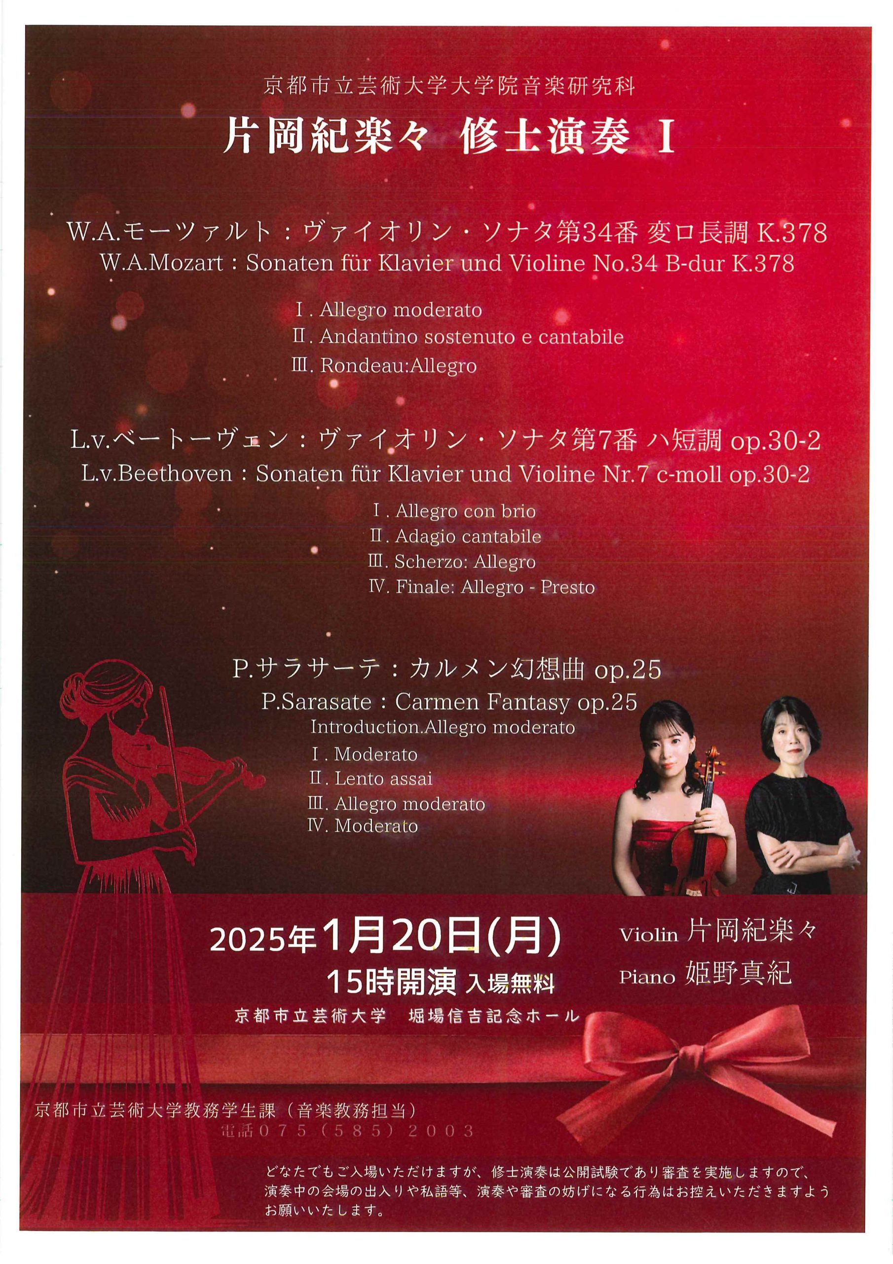 | 出演者 | 片岡 紀楽々(ヴァイオリン) 姫野 真紀(ピアノ) |