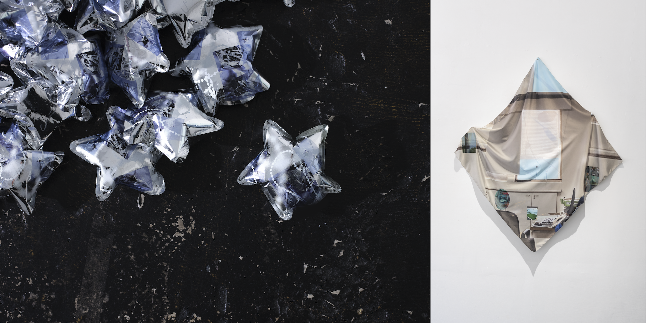 近年の制作では、『壁紙』というキーワードに引っかかり、ハンカチやバルーンといった既製品のボディをお借りしながら、主体・支持体と背景の関係性にどんどん着目。バルーンに少しだけ空気を入れて膨らませることや、風が作品をわずかに揺らすような、流動的で不安定な状態。日常の断片や秩序を少しぶらせつつ、プリントとリアルの差異を弄ぶように印刷することで、複製のあいだに生まれる“ズレ”を、ポジティブな揺らぎとして受けとめている。