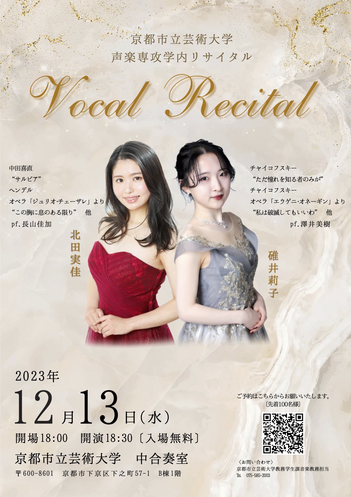 京都市立芸術大学音楽学部声楽専攻4回生によるリサイタルを以下のとおり開催します。