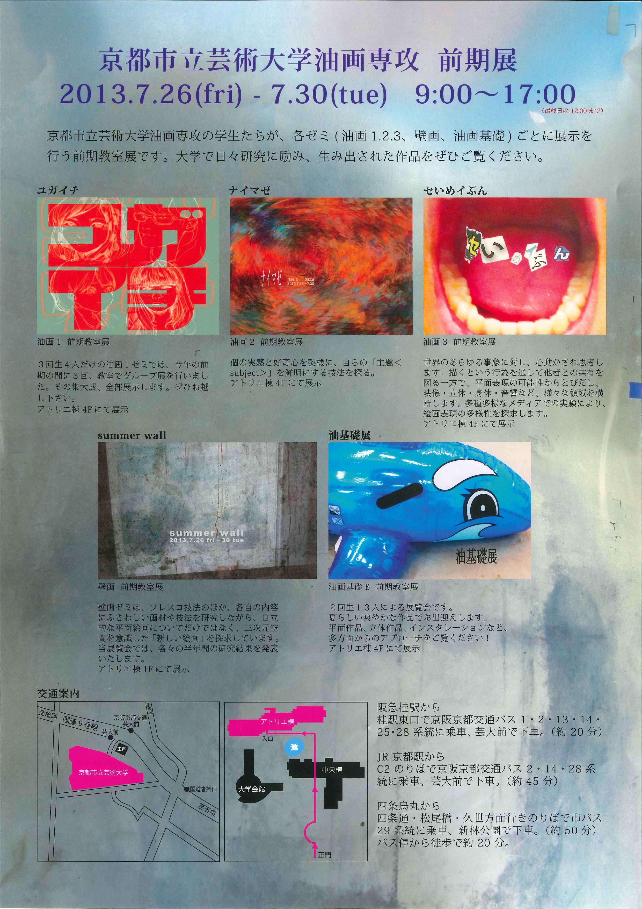 京都市立芸術大学美術学部油画専攻の学生たちが,各ゼミ(油画1.2.3,壁画,油画基礎)ごとに展示を行う前期教室展です。大学で日々研究に励み,生み出された作品をぜひご覧ください。